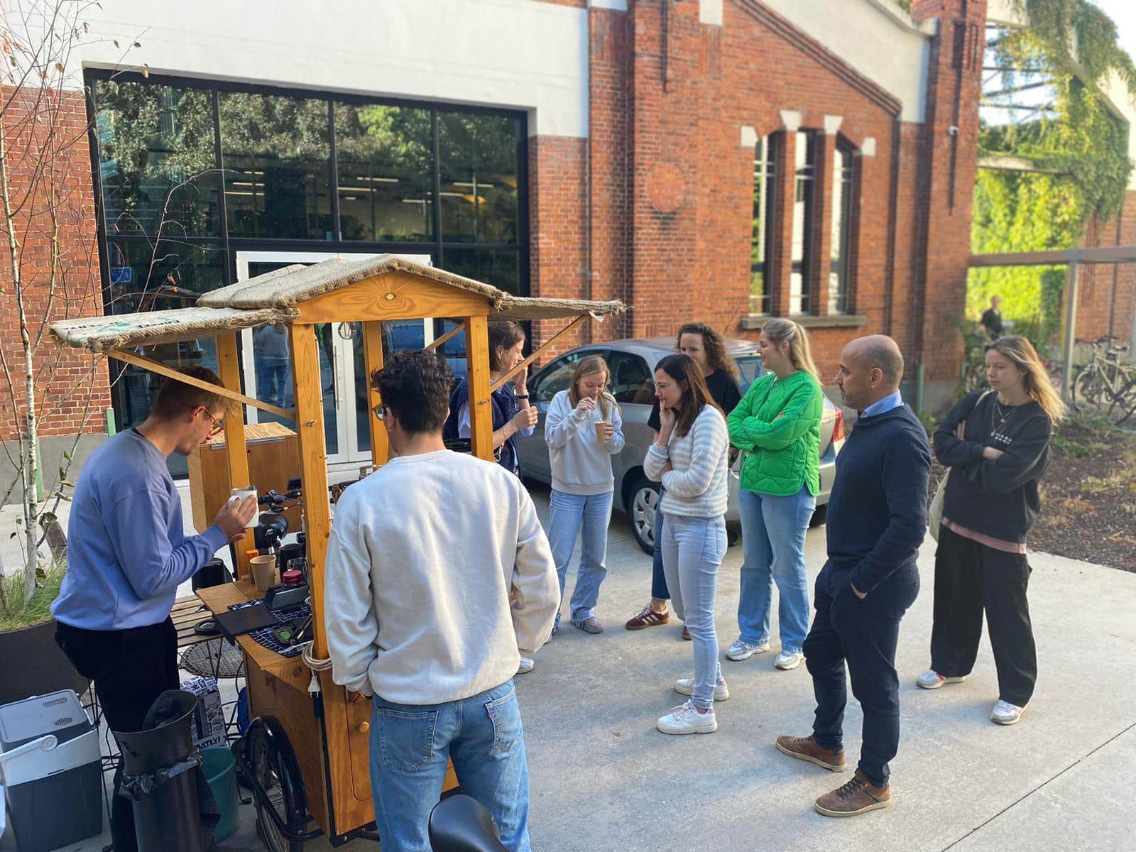 Om de terugkeer naar kantoor voor iedereen een stuk aangenamer te maken, riepen we de hulp in van een lokale held op wielen: Jonas van Bakkie Gent! Met zijn legendarische bakfiets, omgetoverd tot een mobiele koffiebar, tourde hij langs alle WATT-gebouwen.